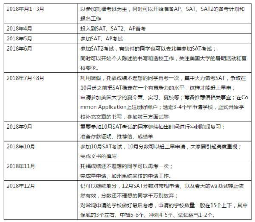 对于2018年申请的同学,明年的SAT和AP考试虽然考试日期上没有冲突,但是对于申请的同学来说,在备考时大家可能面临需要同时备考托福、SAT、SAT2、AP的压力,在时间上还是要好好规划。